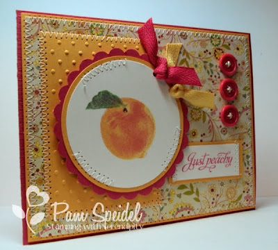 First of all you did a simply amazing job on the peach!! Wow, I wish I had one near by I could eat it looks so good! You've done a great job with the card. Love the stitching and the ribbon treatment on the circle.